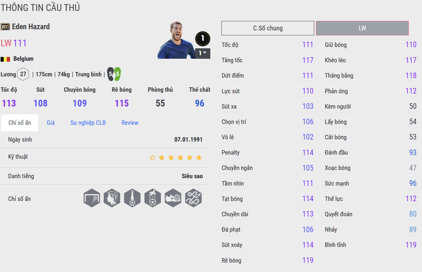 | E. Hazard | Xuất sắc | Xuất sắc | Tốt | Tốt | Chelsea, Real Madrid, Bỉ |