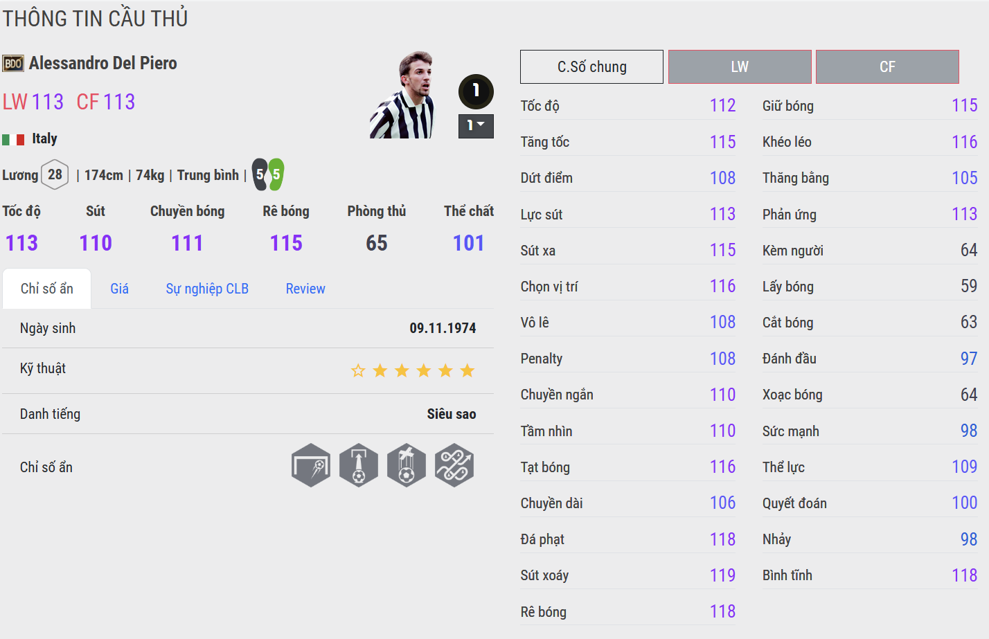 | A. Del Piero | Tốt | Tốt | Xuất sắc | Xuất sắc | Juventus, Italia |