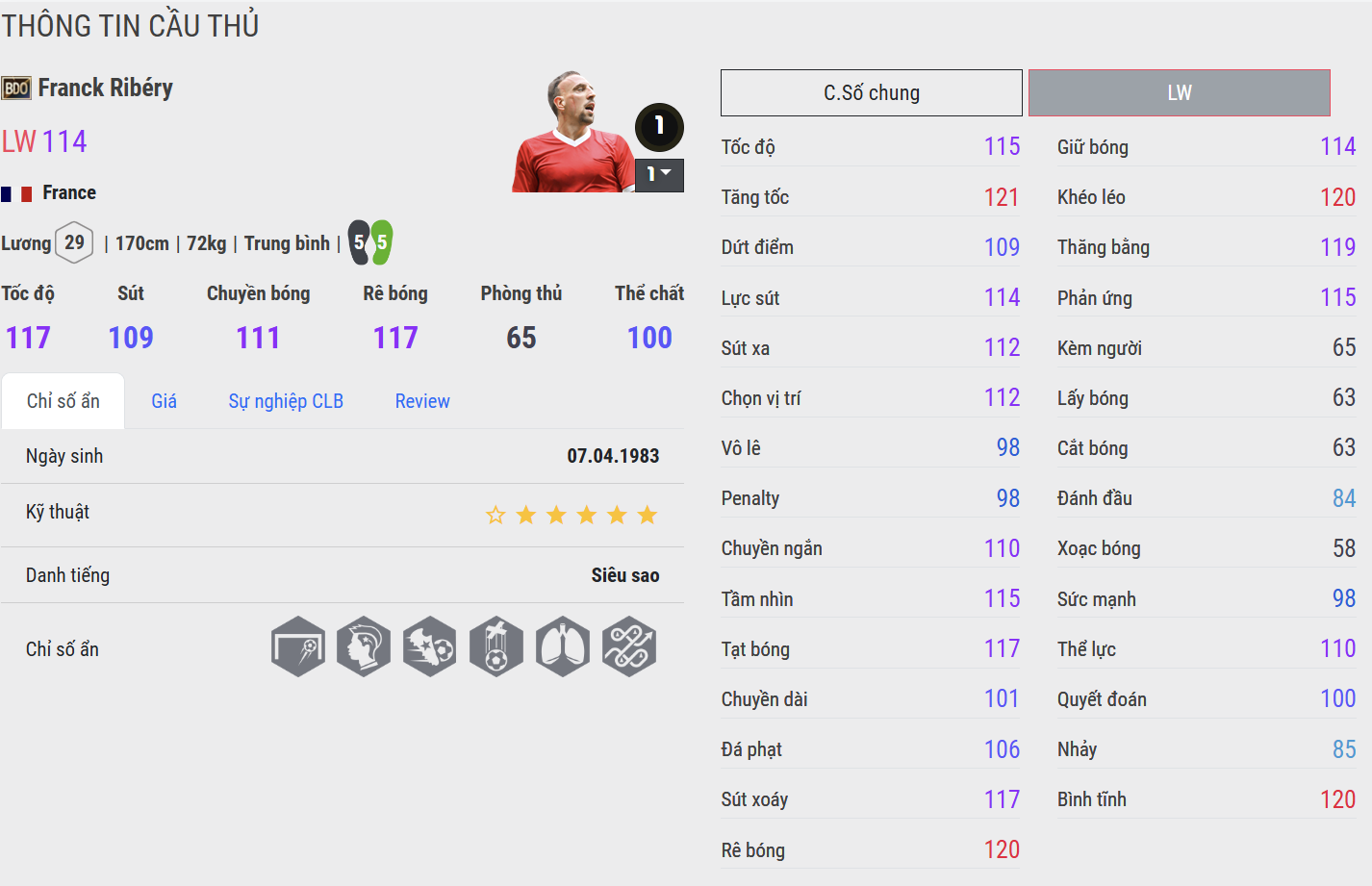 - Kỹ năng 2 chân 5 sao: Ribery sử dụng cả hai chân linh hoạt, giúp anh rê bóng, sút và chuyền bóng hiệu quả ở mọi tình huống.