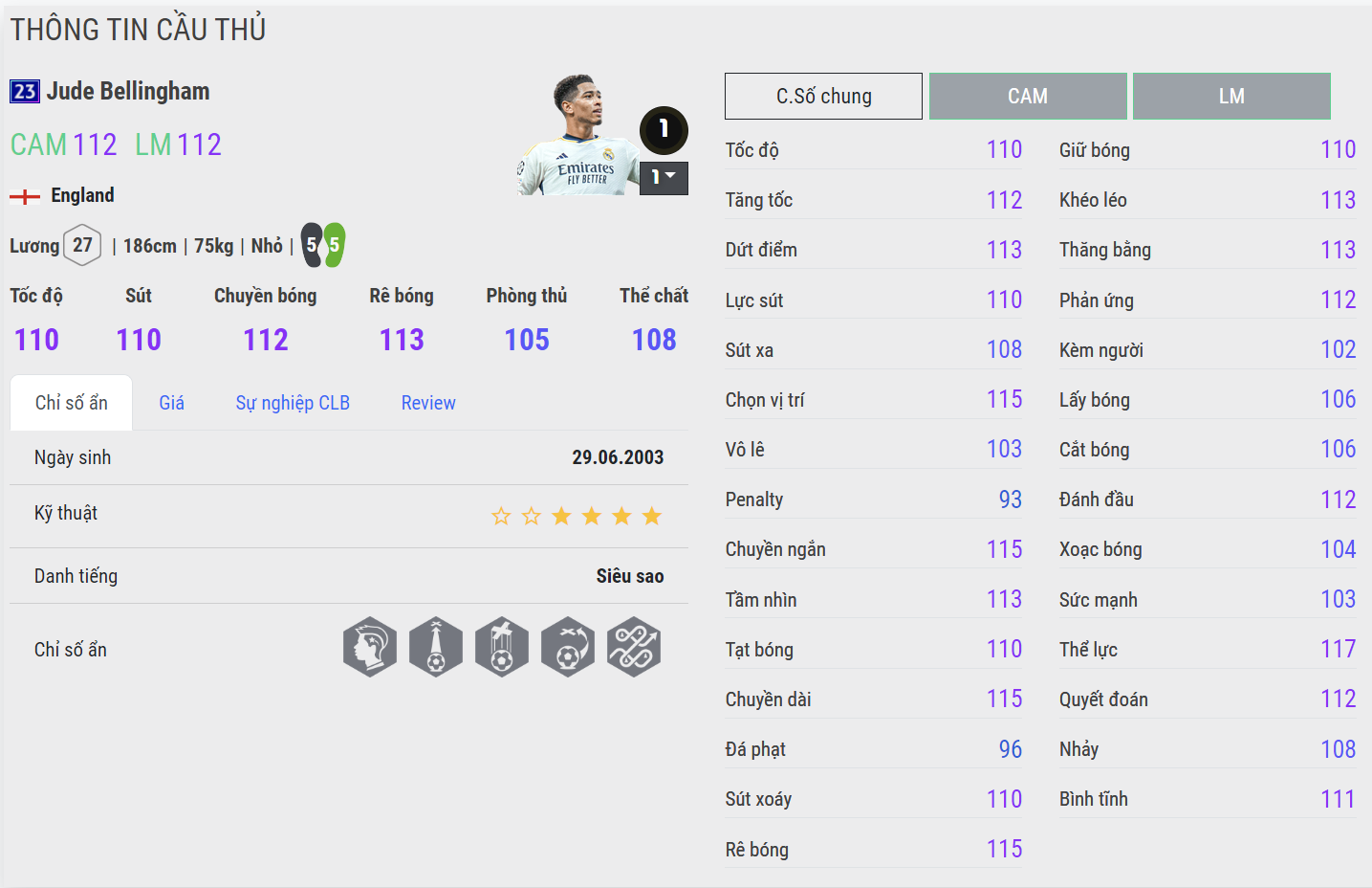 - Toàn diện công thủ: Bellingham sở hữu bộ chỉ số cực kỳ đồng đều. Anh ta không chỉ tấn công hay mà còn hỗ trợ phòng ngự rất tốt nhờ thể hình, thể lực và khả năng tranh chấp ấn tượng. Điều này giúp giảm tải cho hàng tiền vệ.