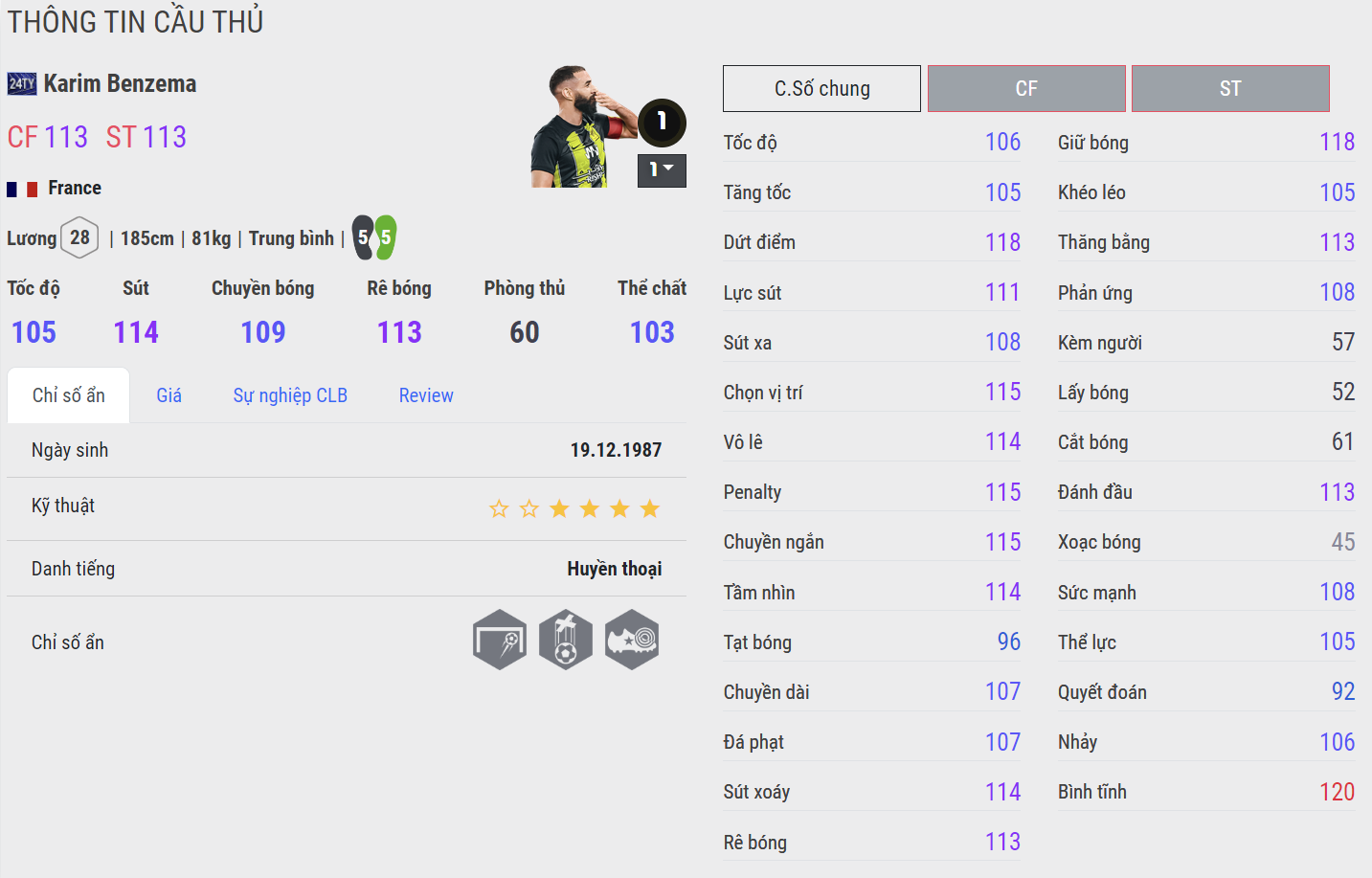 Benzema 24TOTY ở vị trí CAM là sự kết hợp giữa một tay săn bàn và một nhà kiến tạo, một lựa chọn đầy sức mạnh và sự thông minh cho tuyến đầu.