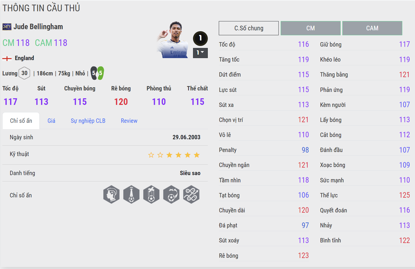 - Nhà kiến tạo đầy triển vọng: Kỹ năng chuyền bóng của Bellingham 24TOTY, đặc biệt là những đường chuyền quyết định ở 1/3 sân đối phương, là rất tốt. Khi đá CAM, anh có nhiều không gian và thời gian hơn để tung ra những đường kiến tạo sắc sảo, hỗ trợ đồng đội ghi bàn một cách hiệu quả hơn rất nhiều.
