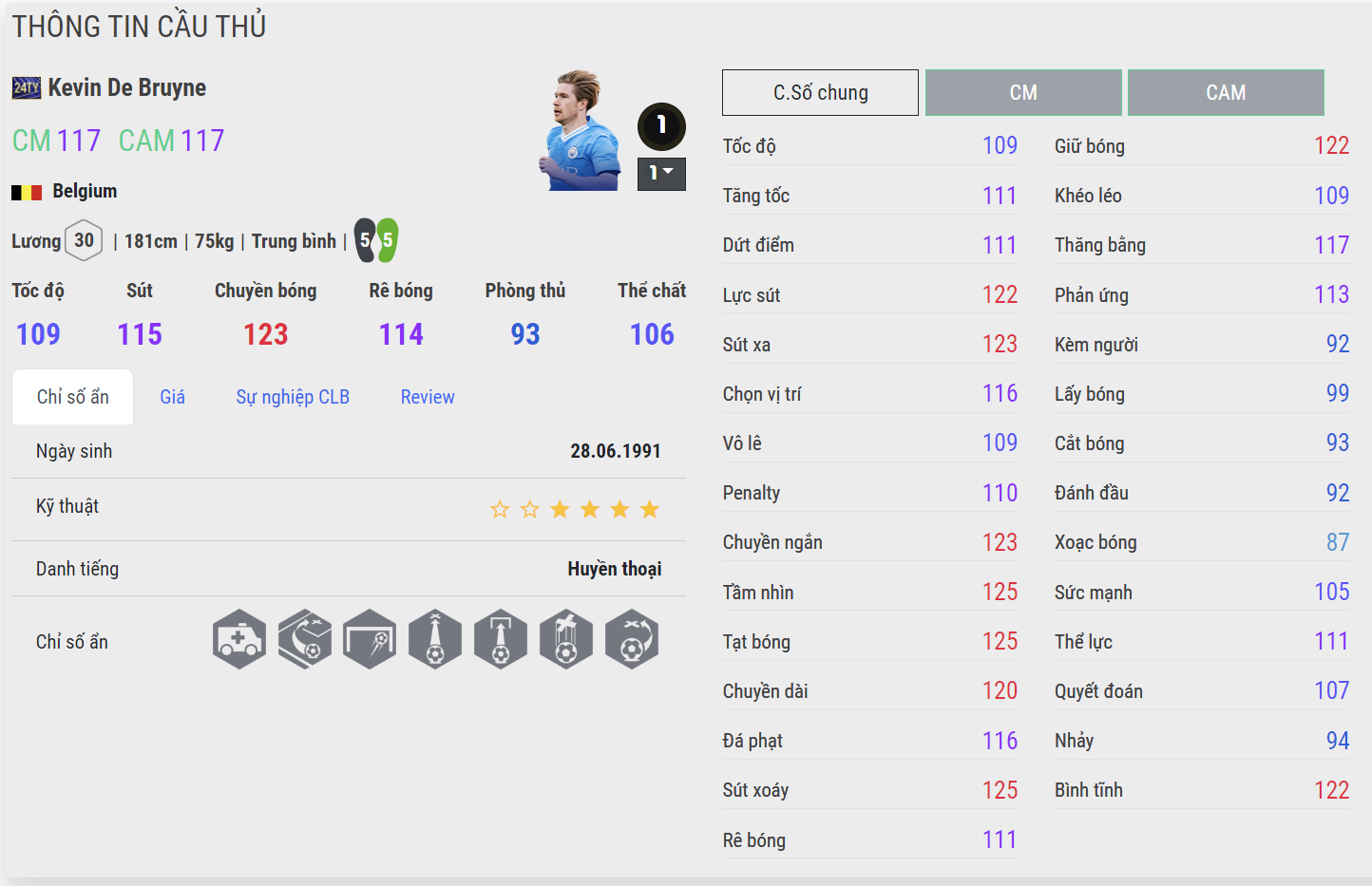 - Toàn diện mọi kỹ năng: Từ rê dắt, giữ bóng, tranh chấp (ở mức ổn), cho đến khả năng dứt điểm và kiến tạo, De Bruyne 24TOTY gần như toàn diện và đáp ứng mọi yêu cầu khắt khe nhất cho vai trò một tiền vệ tấn công trong mọi sơ đồ chiến thuật, đặc biệt là ở vị trí “nhạc trưởng” của đội bóng.
