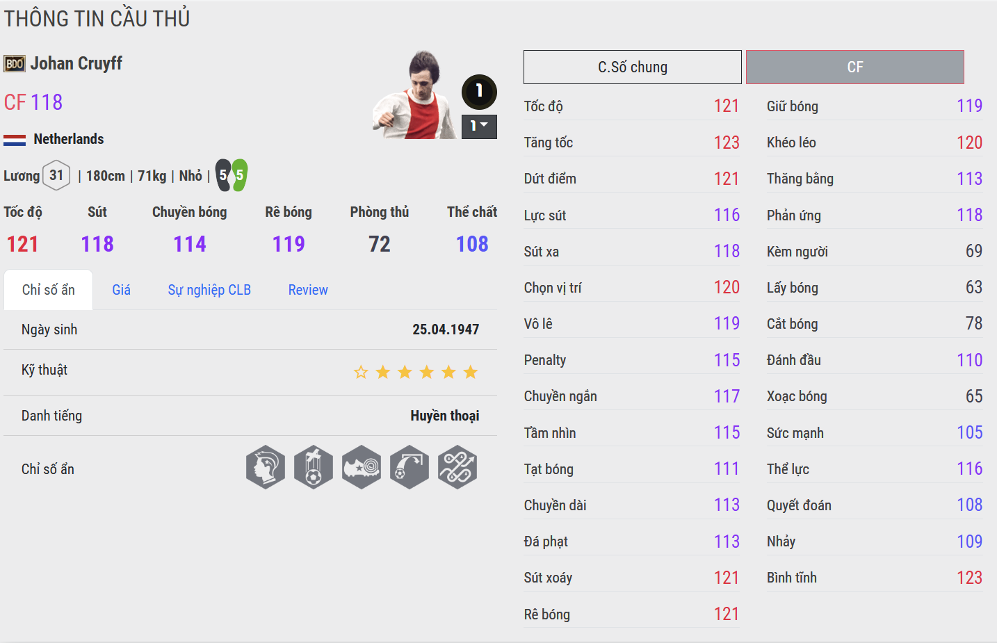 | J. Cruyff | Tốt | Xuất sắc | Tốt | Xuất sắc | Ajax, Barcelona, Hà Lan |