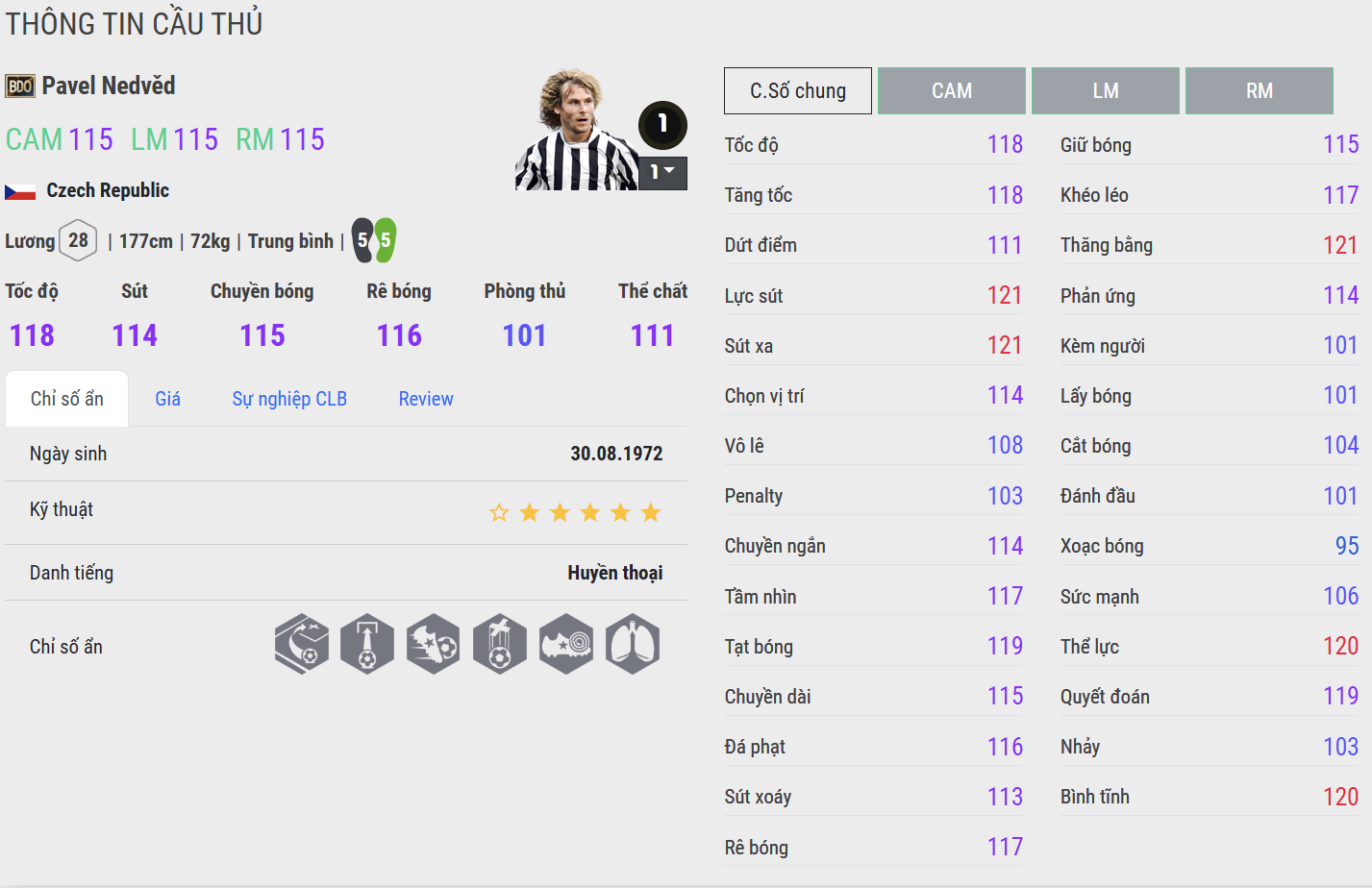 | P. Nedved | Xuất sắc | Tốt | Tốt | Tốt | Juventus, Cộng hòa Séc |
